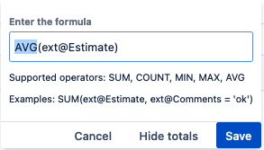 AVG(ext@Cost, ext@Cost > 2 AND jira = 'JIR-1') | Counts the requirements with a Cost external property greater than 2 associated to the Jira ticket 'JIR-1' | |