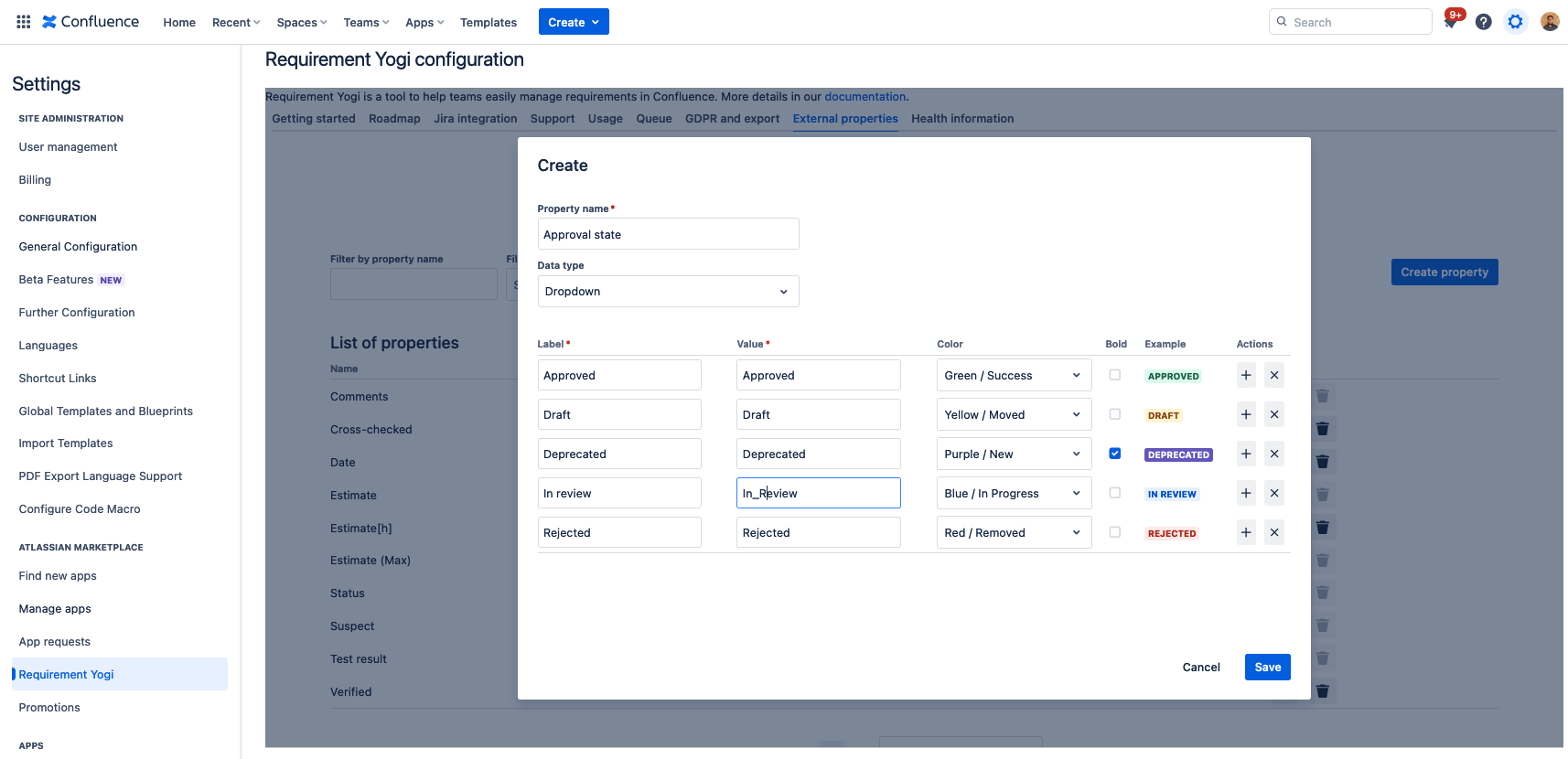 External properties are defined in the requirement’s detail, or in the Traceability Matrix. Their use case is to let you add metadata to requirements without affecting the Confluence page.