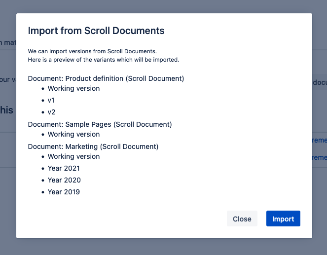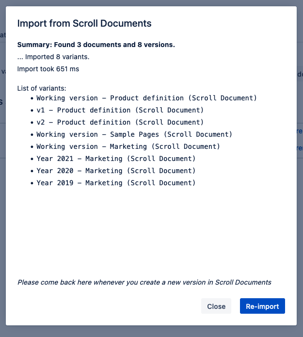 It enables you to import all documents and versions managed by Scroll Documents as variants.