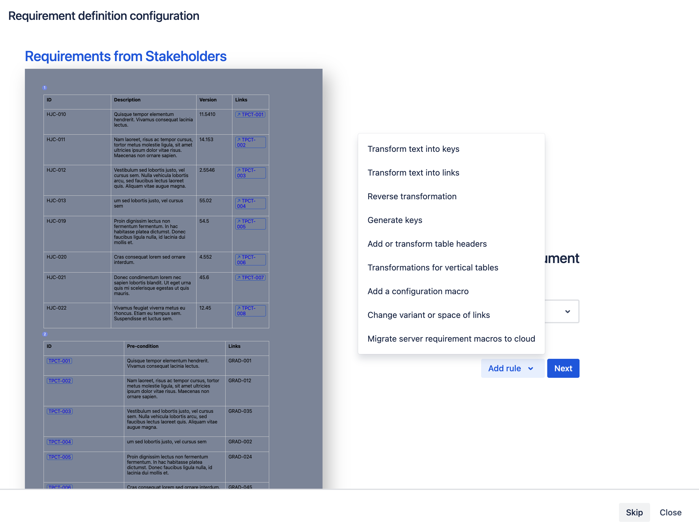 If you have imported your requirements, or already wrote keys in your tables. Transform the text into requirements keys;