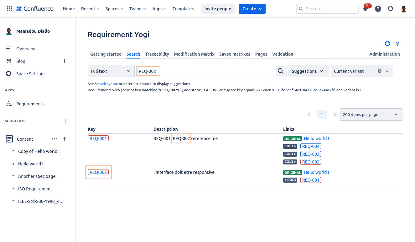 Currently, you can only search for requirements that are in the same space. We will develop the cross-space search in later versions. In both Search and Traceability matrix screens, you can click on a requirement to display a popup with its description, properties, dependencies and links.