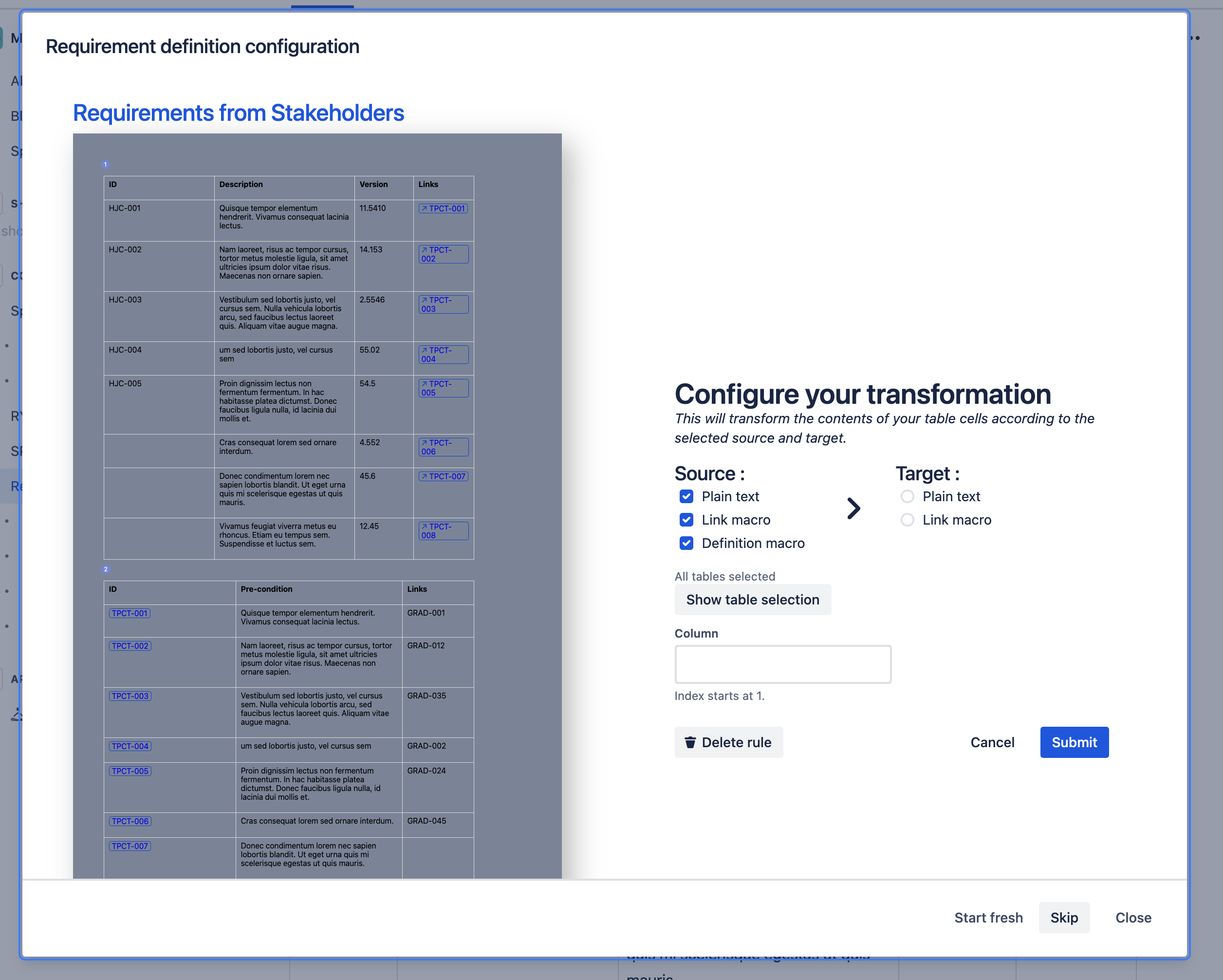Select the source: Link and Definition macro; and the target to Plain text. Also make sure to select the destined tables and columns.