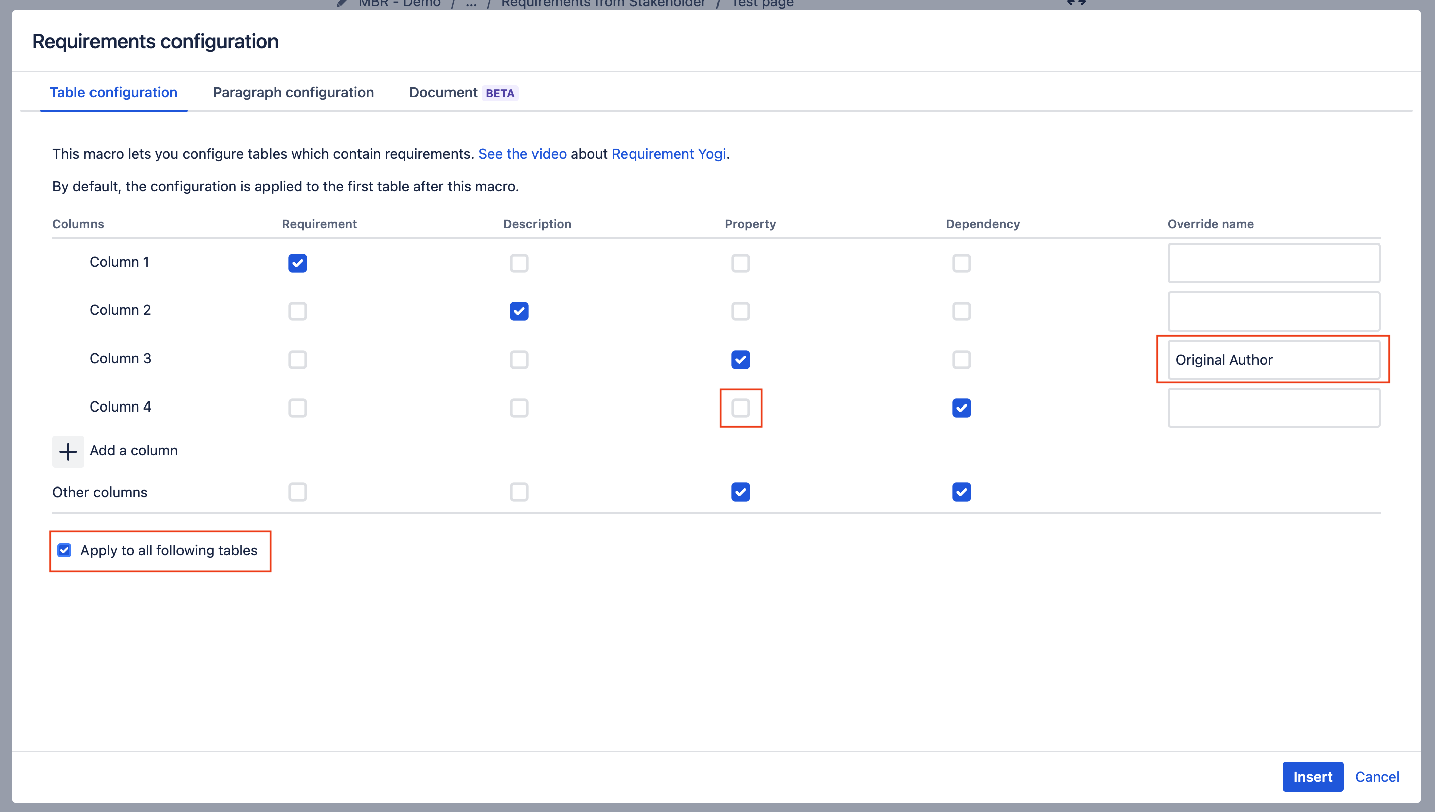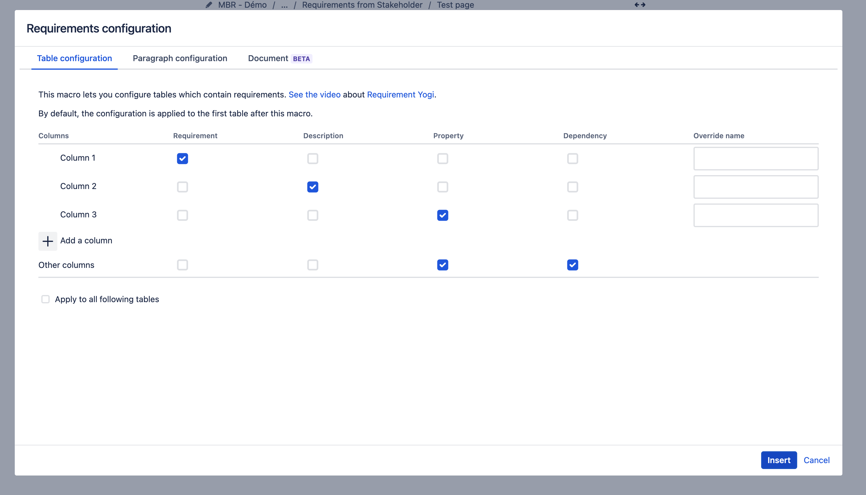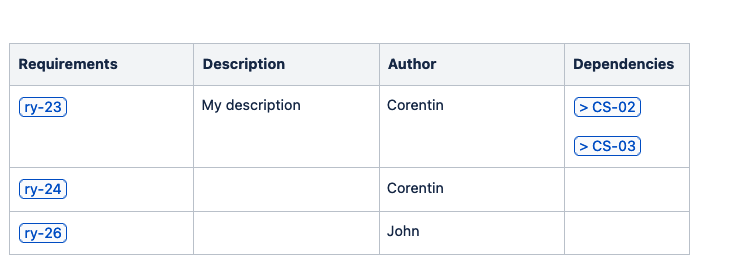 Here is the default configuration for requirements in tables: With the configuration macro, you can: