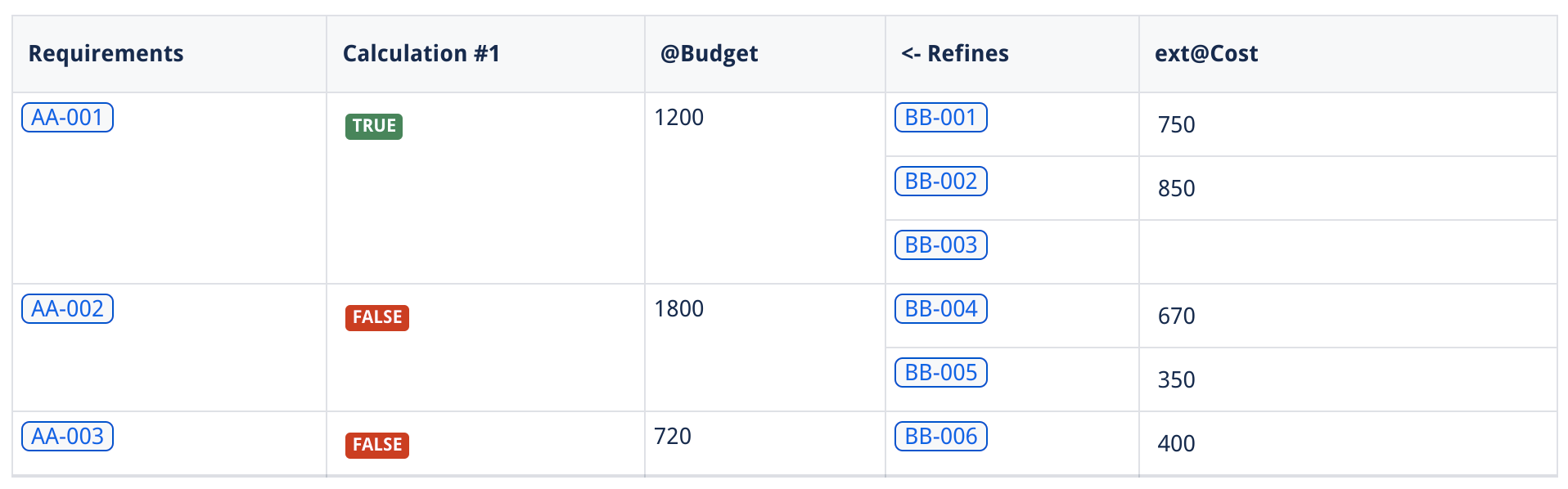 Here, we see that the result for requirement AA-003 is marked as error because the property @Man days used in the calculation is not a valid number.
