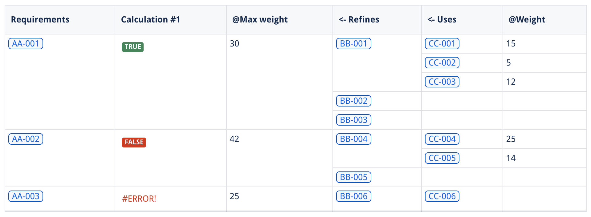Here, we see that the result for requirement AA-003 is marked as error because the property @Weight used in the calculation is not a valid number.