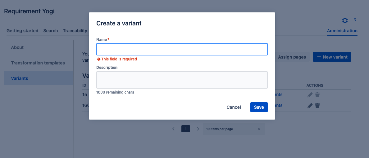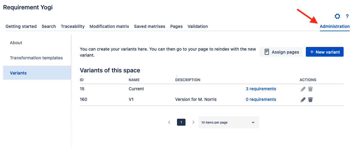 As a space administrator, on the Requirement Yogi Administration page of the space, you can manage variants.