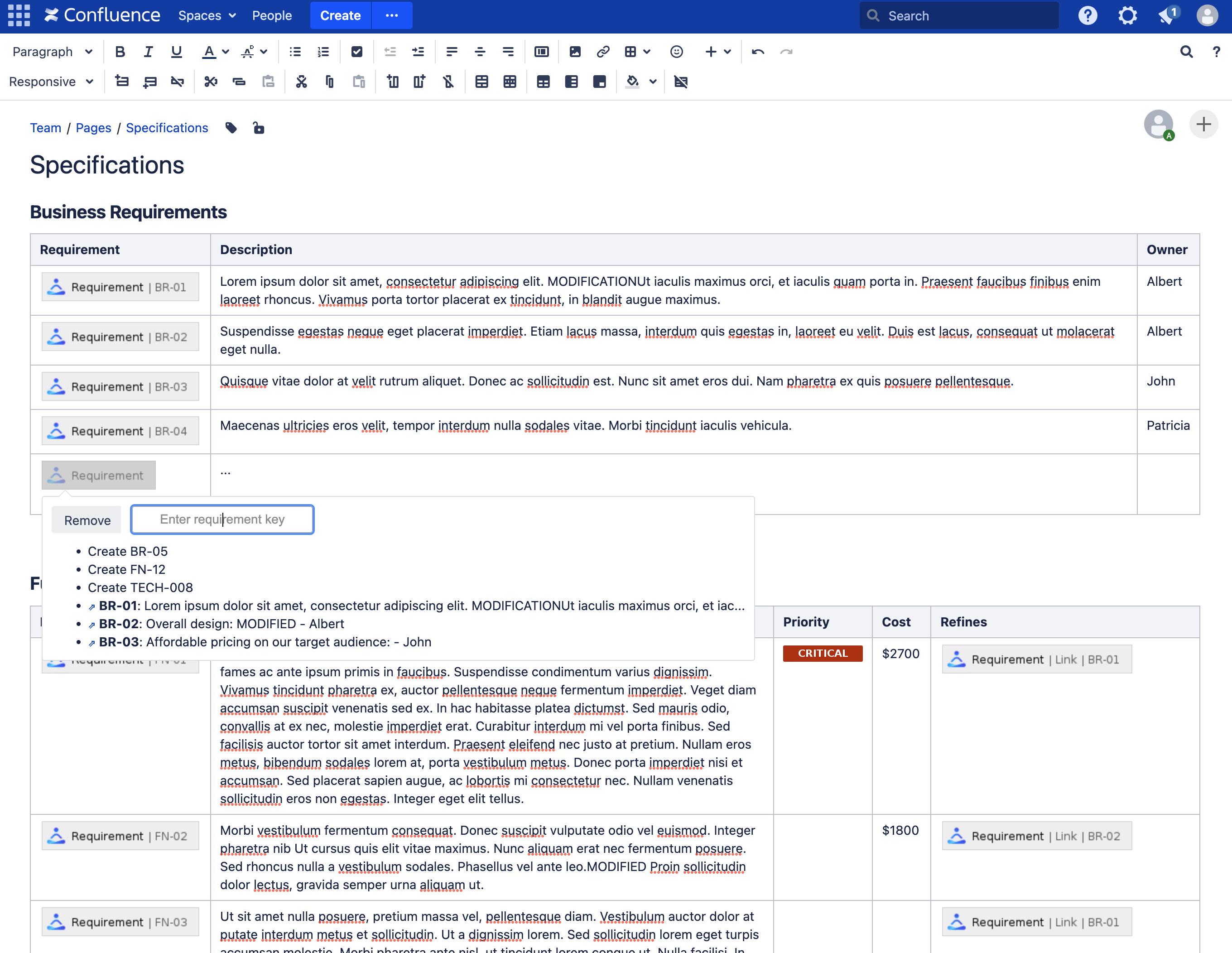 Confluence is definitely the best place for requirements. After working with analysts and looking closely at their workflow, we noticed they were keen to start their requirement gathering activity with Confluence. It's only later, through iterations and refinement, that they define business rules. To identify those in contracts and testing sessions, they define a unique key for each of them, and that's where Requirement Yogi gives you a competitive advantage.
