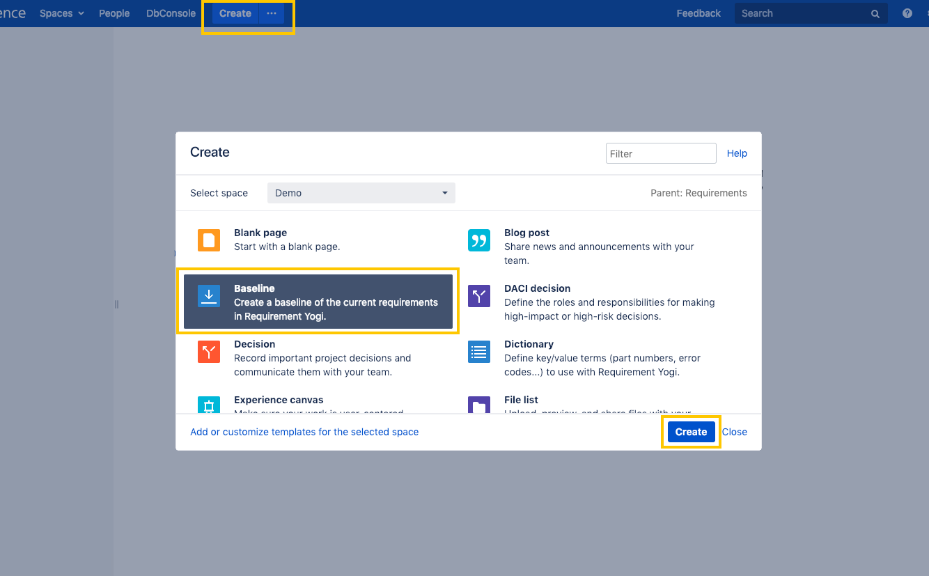 3. Create a baseline from the Create buttonThis option will create a ‘Baseline page’ for you, here is more information: Baselines and versioning | How-does-the-Baseline-page-work-? . | ![]() |