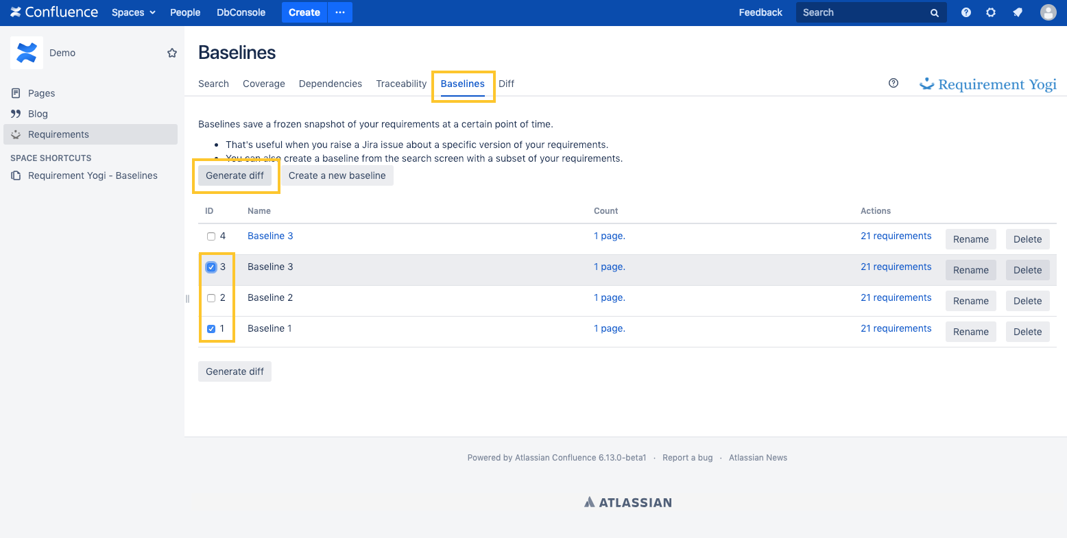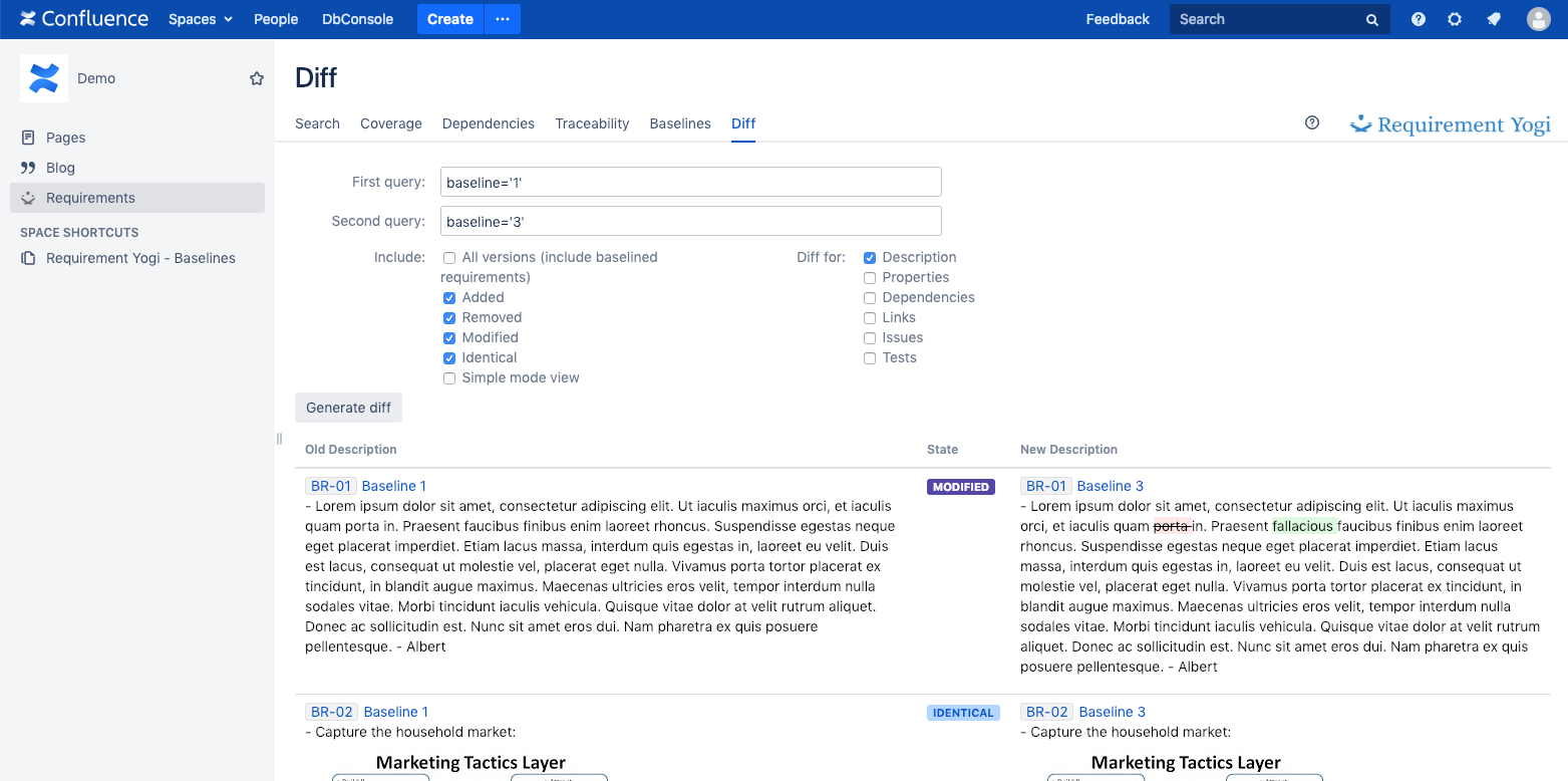 On a page, click the "byline", select "Compare" and choose a baseline to compare to. It will highlight modified requirements. | ![]() |