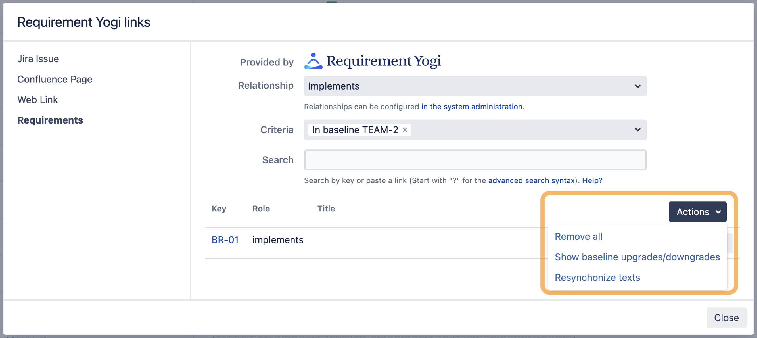 In the JIRA link dialog, go to 'Criteria' and add the baseline you want. Tip: If the baselines don't show, it means your administrator has not configured the link between the project and the Confluence space. Once you've ticked a baseline, search for requirements. Only those in the baseline will display. | ![]() |