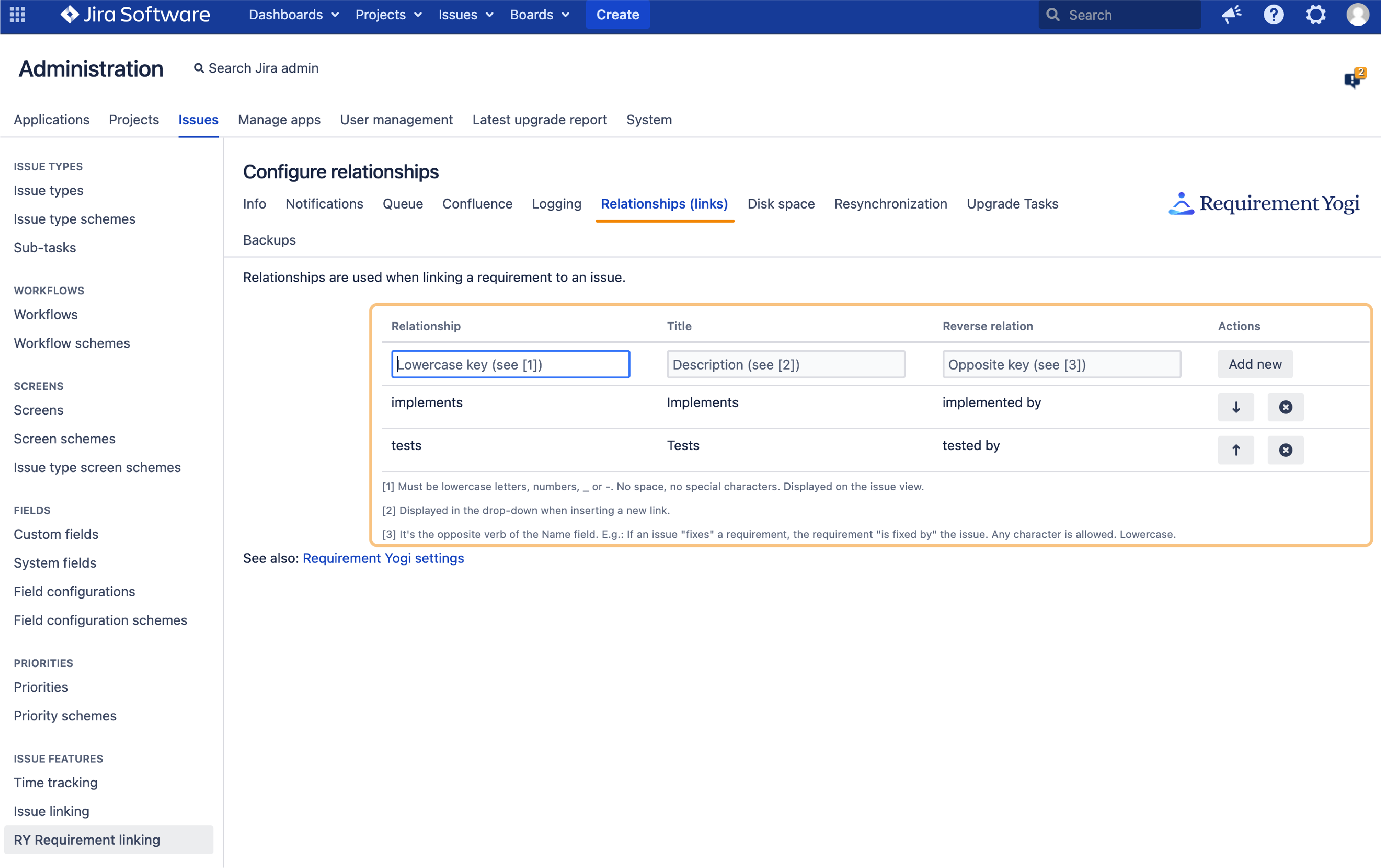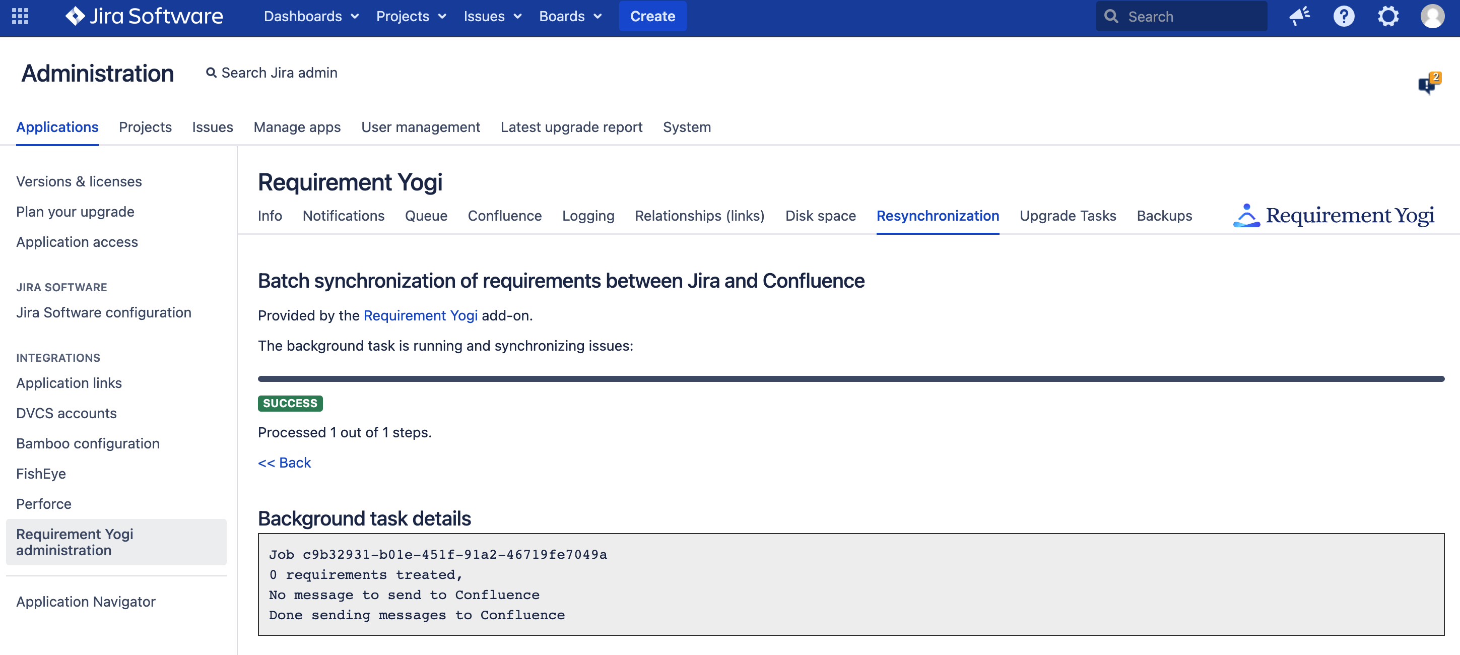 JIRA issues reflect the links at the time of creation. If you want to update links (for the title, or if the requirement moved or was deleted), please click "Synchronize" on the given issue. Alternatively, you can request JIRA to update all Requirement Yogi links, although it may be long depending on the number of issues you have and the quantity of requirements to update. To apply the global synchronization, go to JIRA Administration → Issues → RY Synchronization. | ![]() |