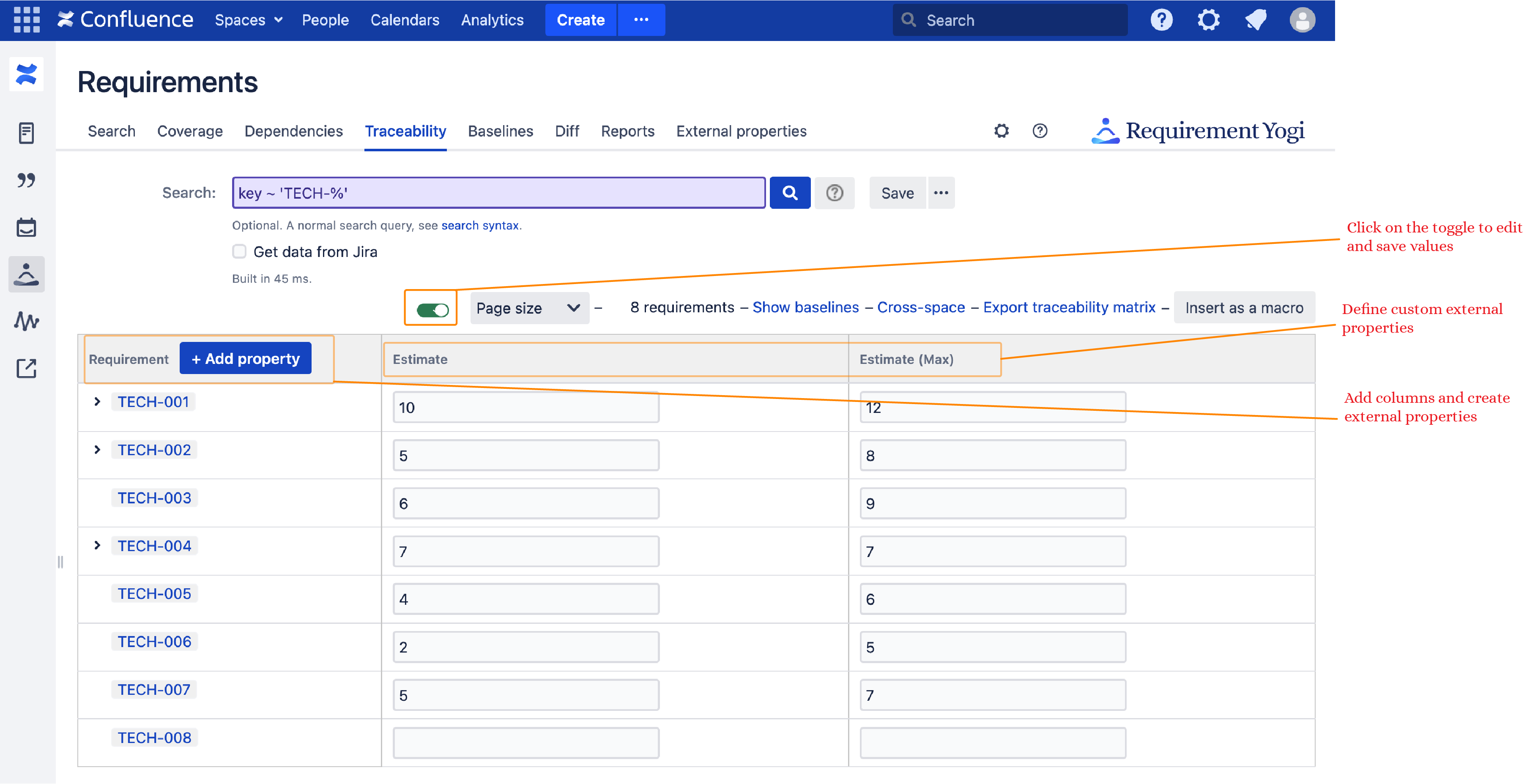 External properties are simply a way to track data about requirements without disturbing the viewers of the original page: Group your requirements by adding a tag, assign a cost, list the impacted components, or add subjective information about them. Beware though: They are visible by everyone in the space, in the popup of the requirement.