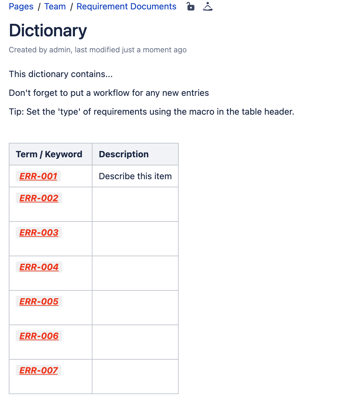 We're introducing the dictionary blueprint in Requirement Yogi. It starts with a template where people can enter any kind of key/description entry: | ![]() |