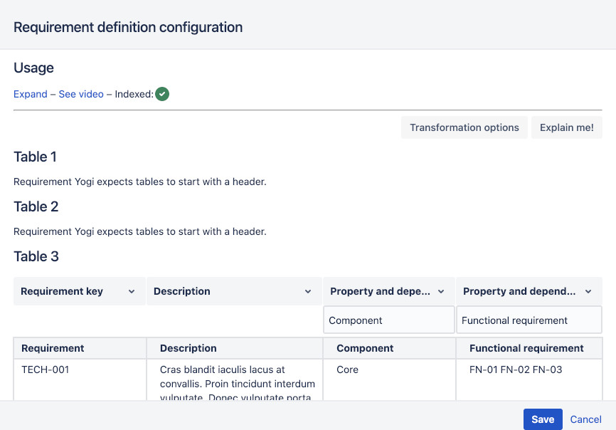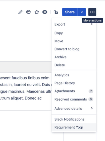 On the cloud, go through each page which contains requirements, and use the menu → Requirement Yogi to display the transformation dialog: | ![]() |