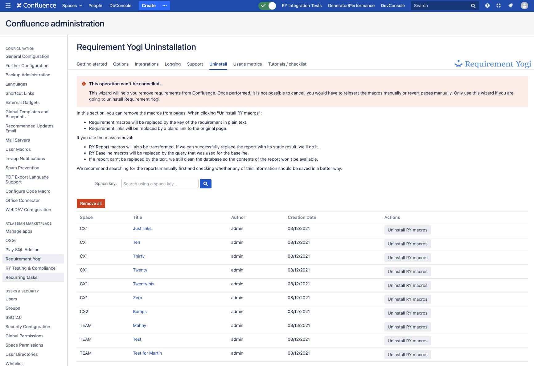 Before you start, perform an entire backup of the database and of Confluence. All the data of Requirement Yogi will be destroyed (baselines, traceability matrixes) and macros removed from Confluence pages.