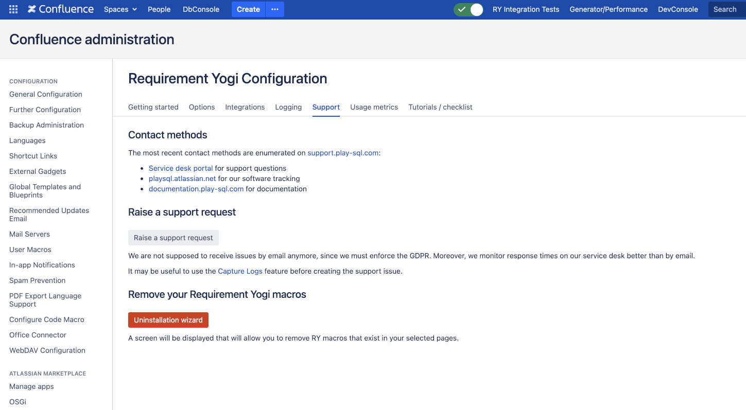 The first step is to replace all Requirement Yogi macros on pages, with simple text (the requirement keys). In Confluence, go to the administration of Requirement Yogi, on the tab "Support" → Uninstallation wizard. | ![]() |