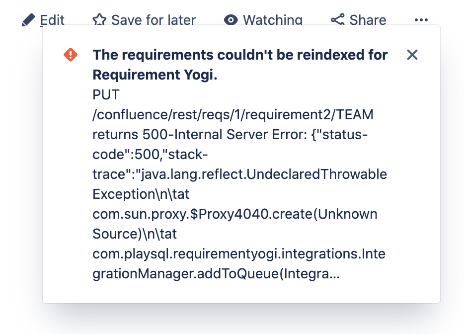 Users may come to you with an error such as "The requirements couldn't be reindexed for Requirement Yogi. (...) addToQueue()":