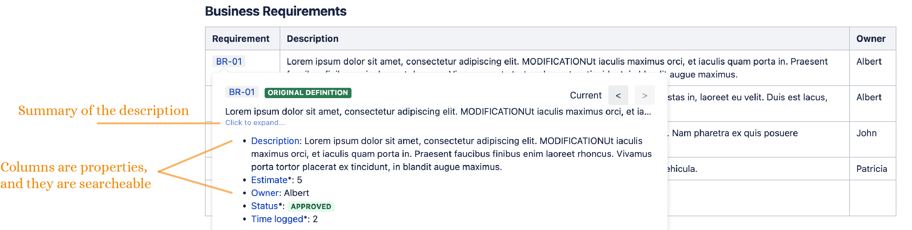 To achieve the configuration of the last section, we've added a small macro in the headers of the table. You can see it on the first screenshot, the name is "RY Properties". Here are the options: