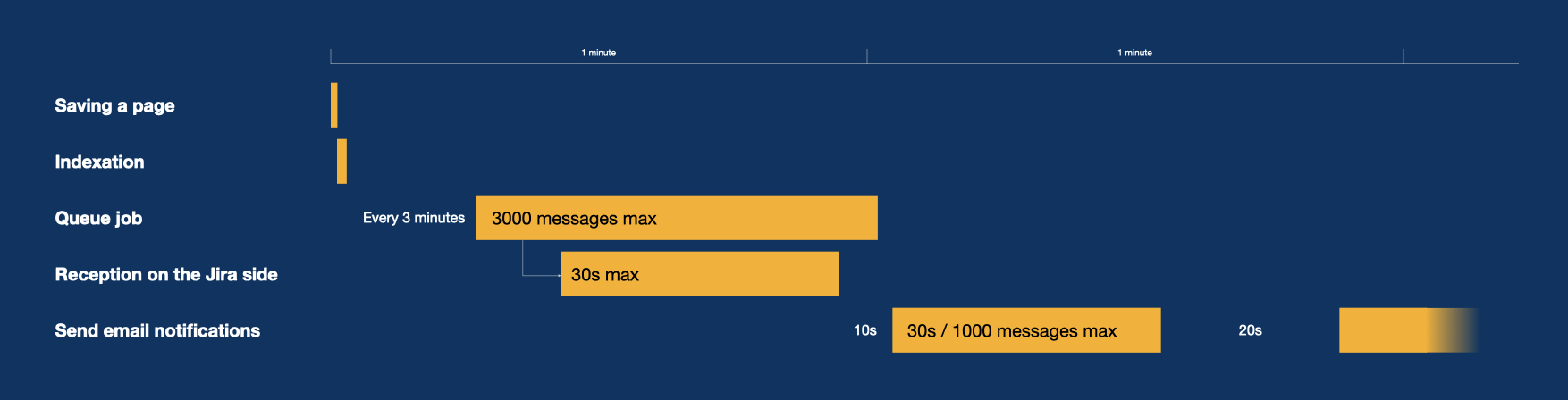 Then notifications are created in Jira at the rate of 300 per second, but limited to 30s and 1000 per batch. The job runs every 50s (so, 1000 items x 50s).