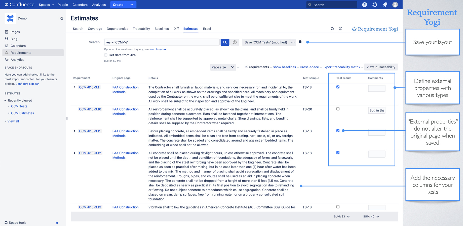 Here is an example of using external properties (checkbox and comments) to tick requirements which have been tested:
