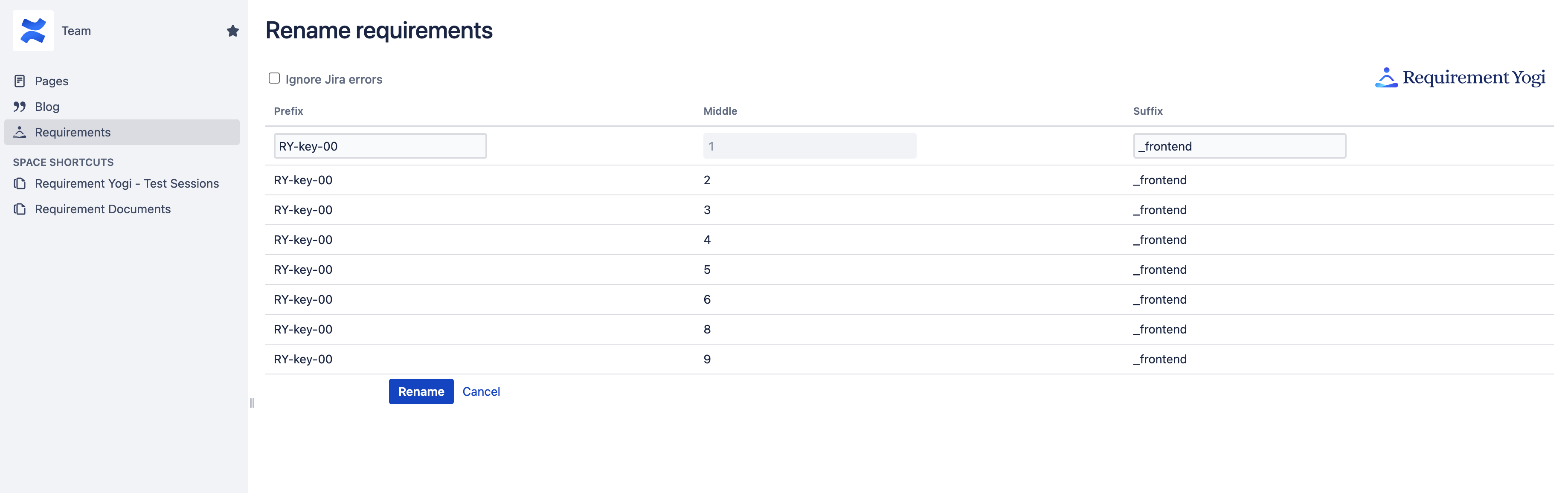 Notice how we used the Search Query to pre-select our requirements. When you select multiple requirements, Requirements Yogi breaks each key into 3 parts: the prefix, the middle key, and the suffix. Prefix and suffix are a common pattern within all the selected requirements, while middle key is the variable part. You can then change your prefix and suffix, and Requirement Yogi will apply the same modification to all your requirements.