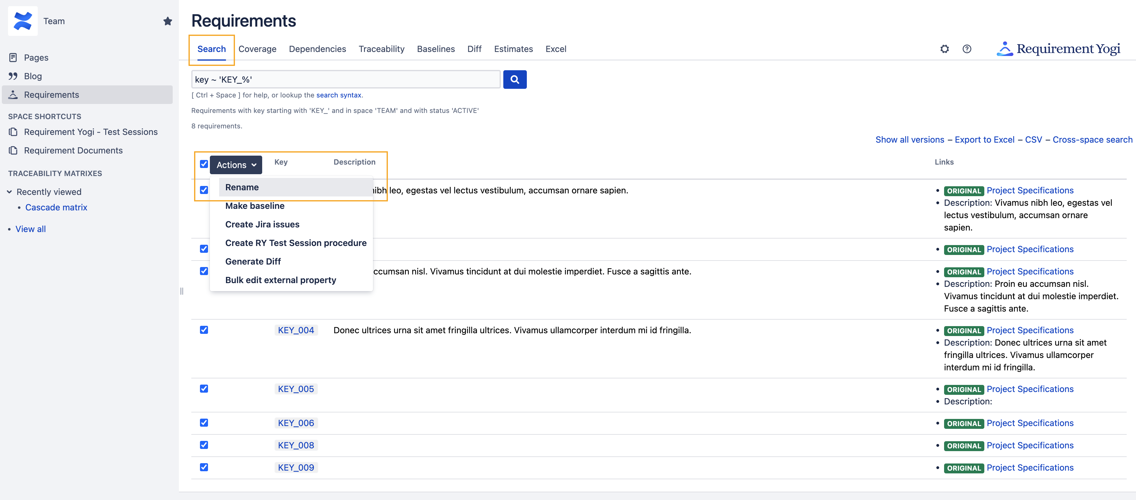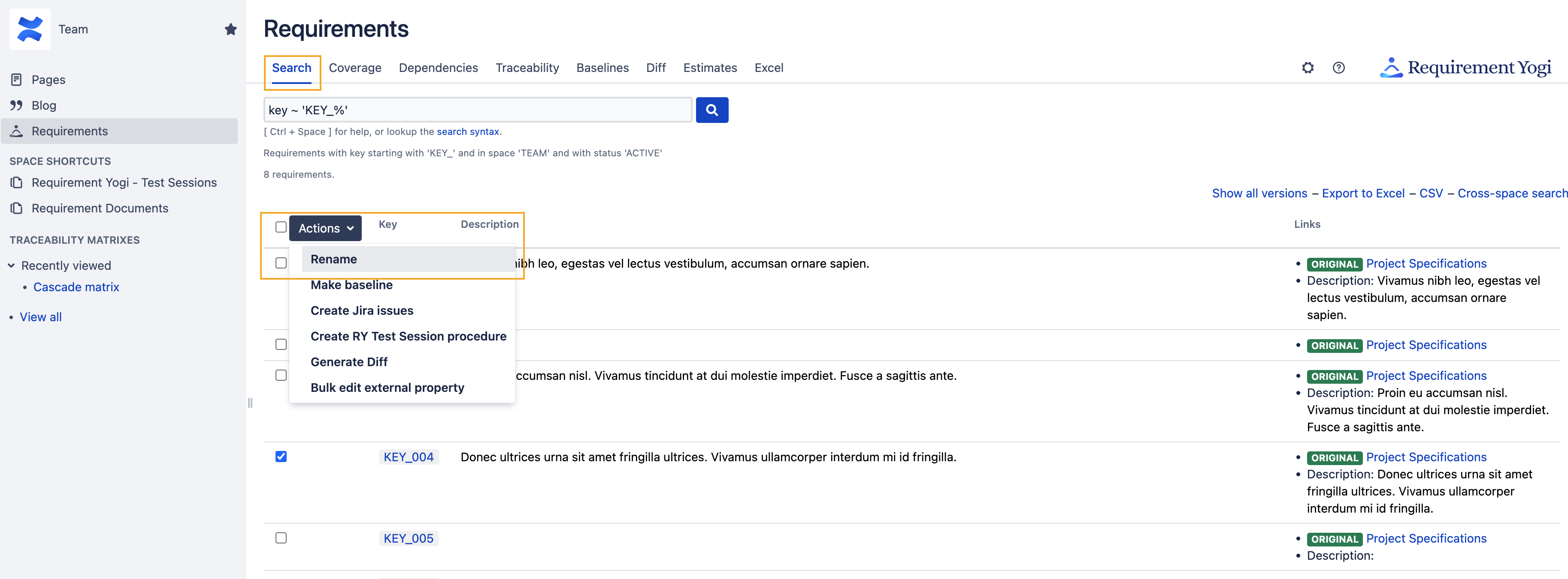 Of course sometimes you'll want to rename a lot of requirements in a single step: Requirement Yogi also handles it. Just selects more than one requirement on the Search screen, then click rename: