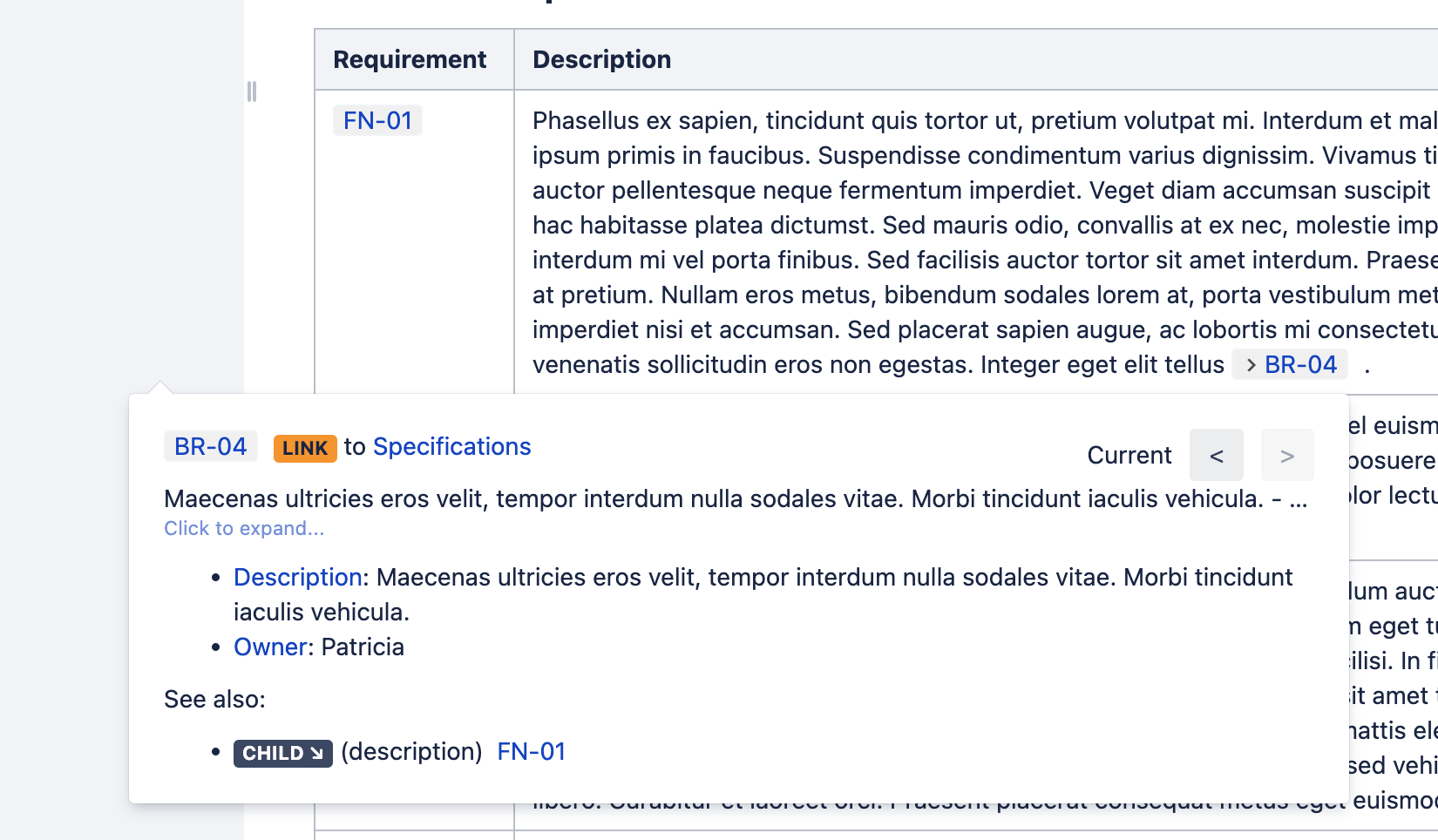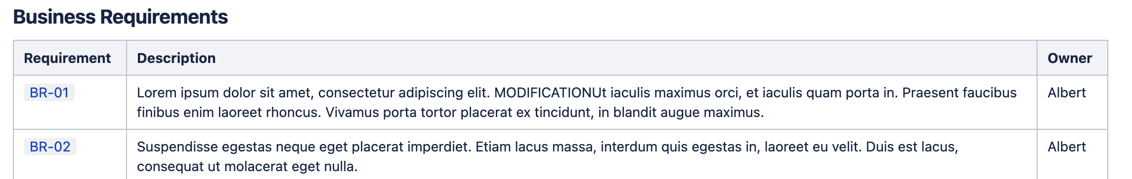 Use a table to structure your requirements, link one requirement per row. | Better not try to define a full paragraph or section of a document as a requirement. |
