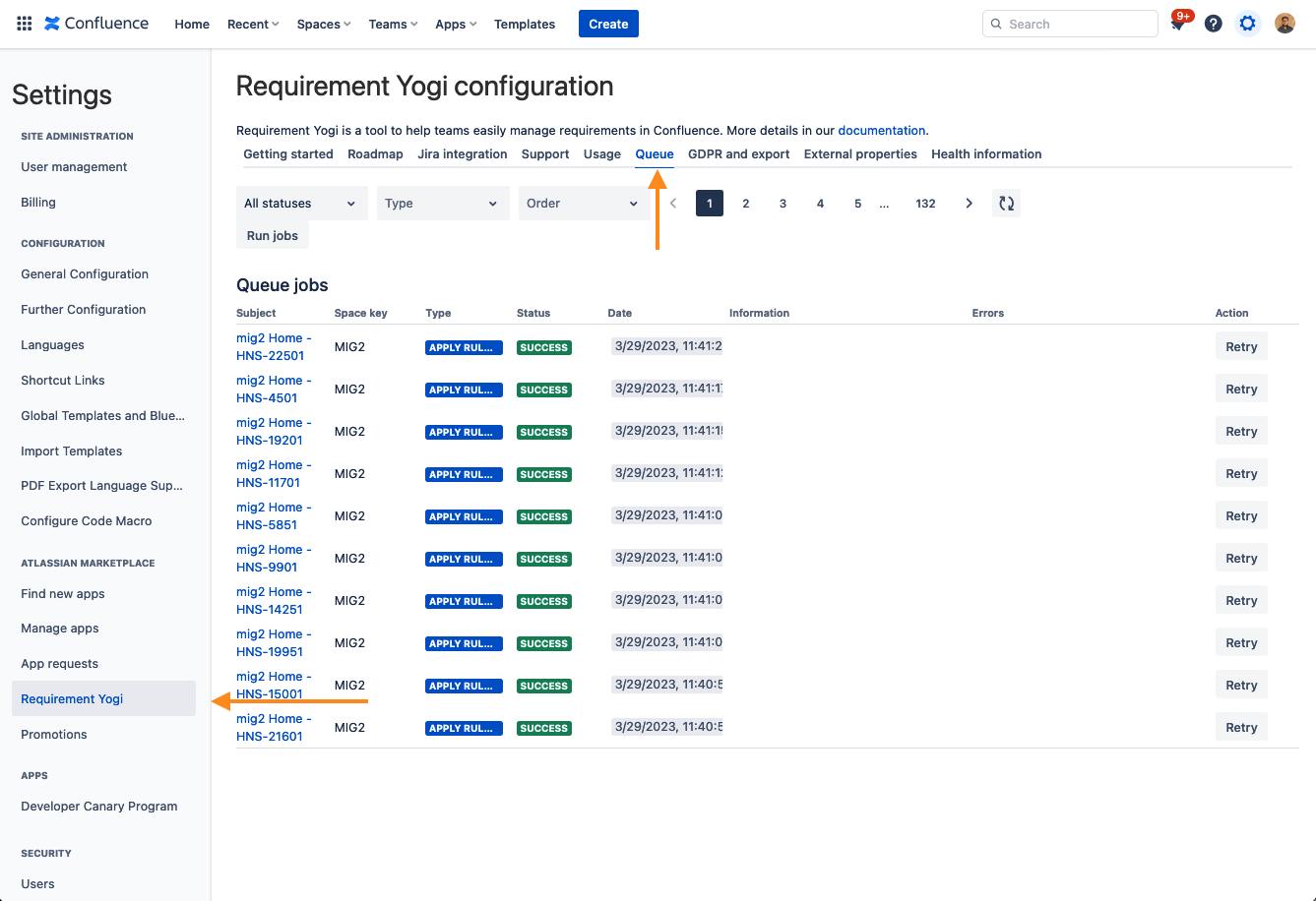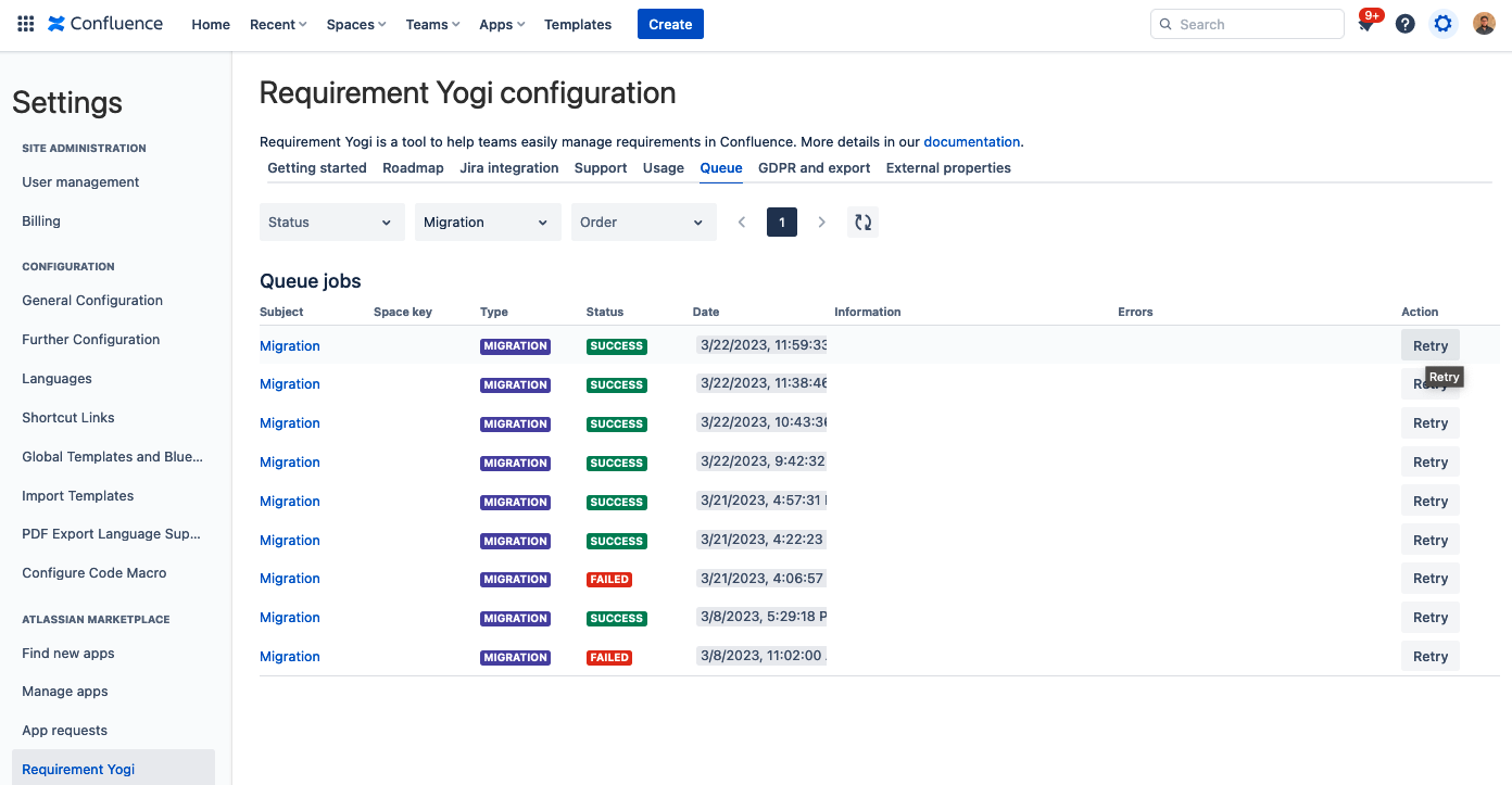 The migration of requirement macros to the cloud format involves searching for pages containing requirement macros. Unfortunately, the search sometimes returns incomplete results and mistakenly assumes that no more pages need to be migrated. In that case, you can run the migration job again by clicking the âRetryâ button in the Queue tab.
