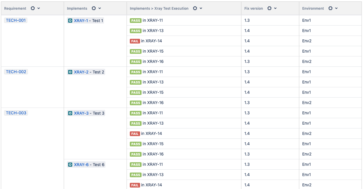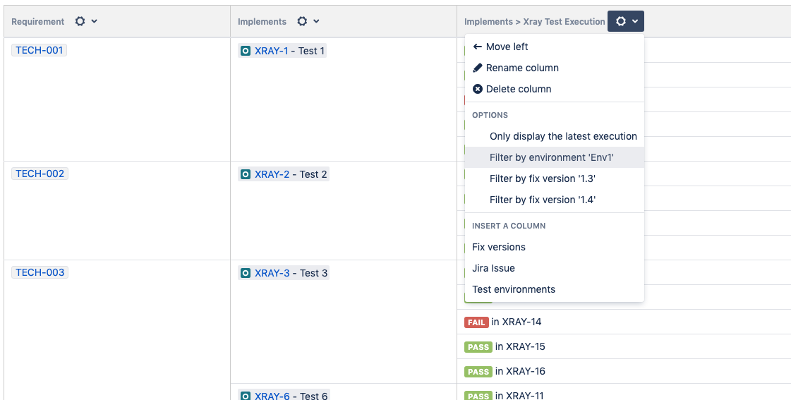 Requirement → Test Execution and their status bars, It is possible to filter by environment, version and to only display the last execution: |
