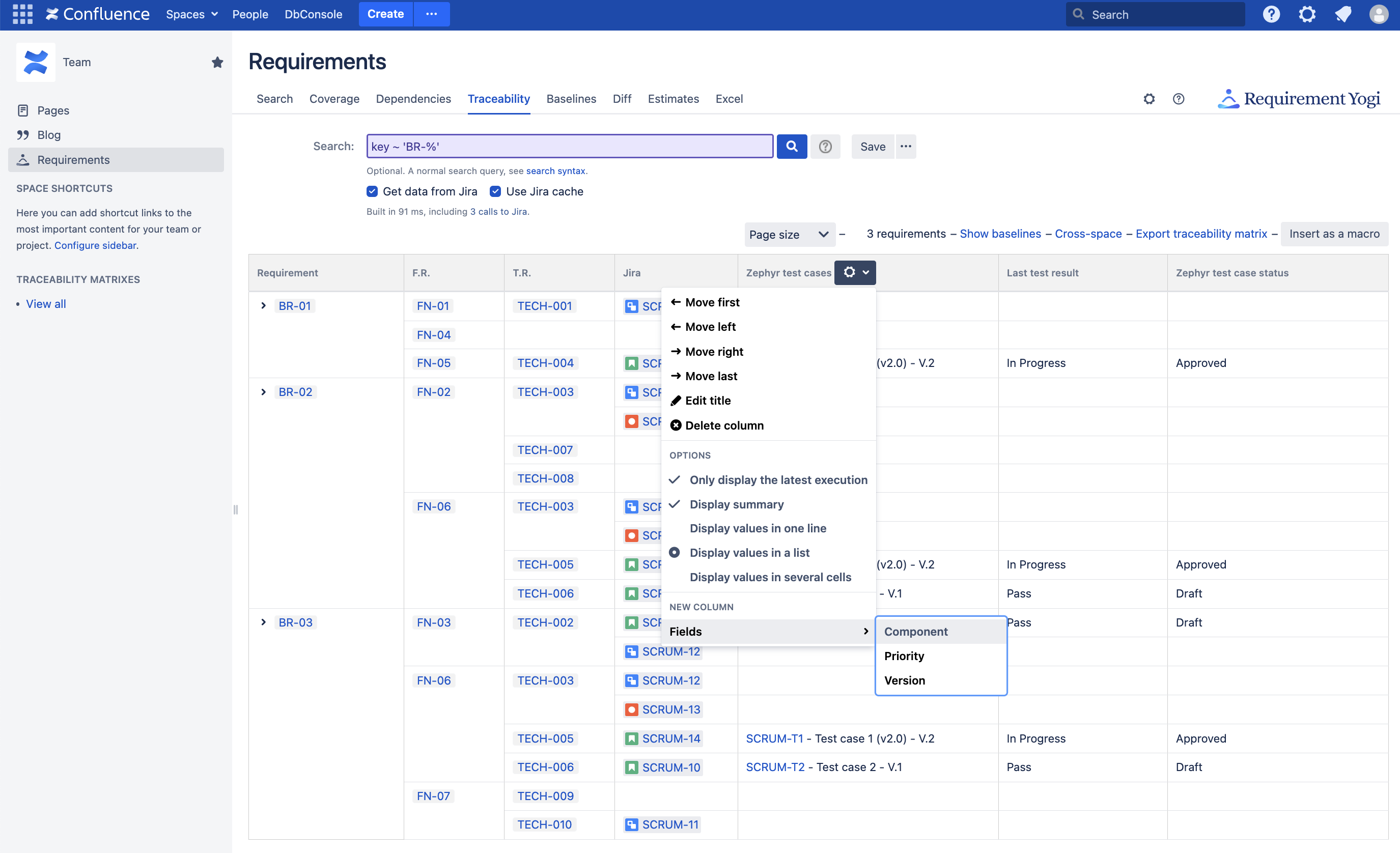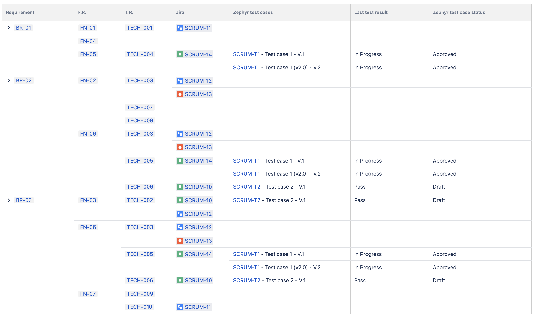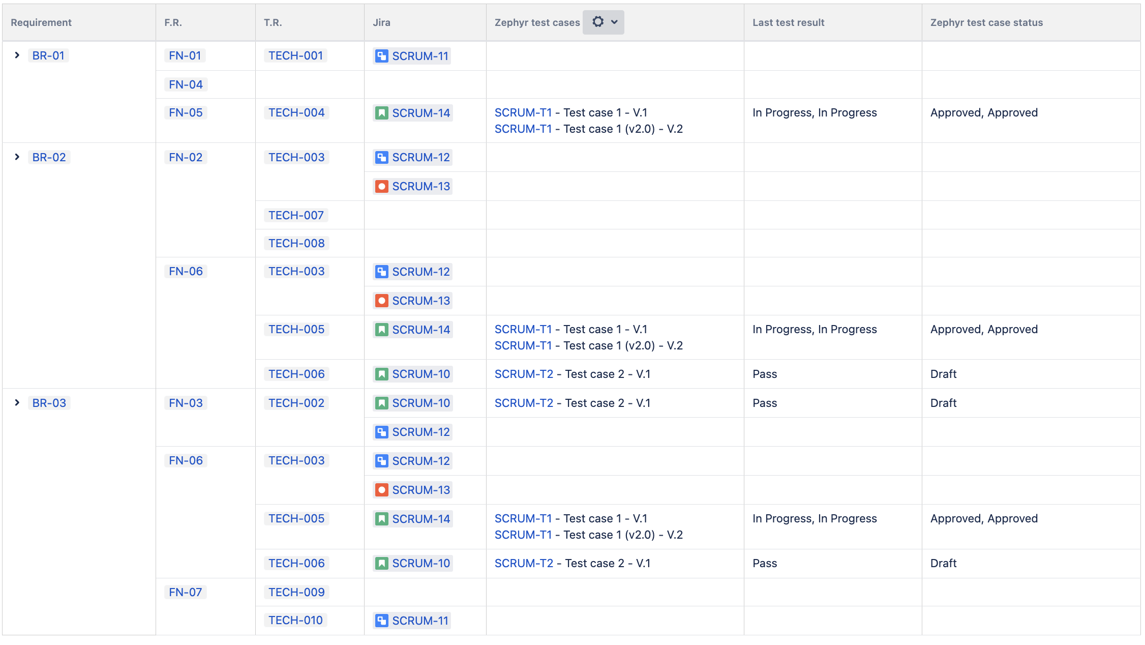 We have an integration with testing tools in Jira such as: Xray (see previous page) and Zephyr Scale (formerly TM4J), and both of them appear in our traceability matrix.